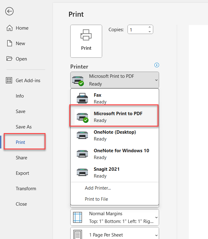 - เลือก Printer เป็น Microsoft Print to PDF