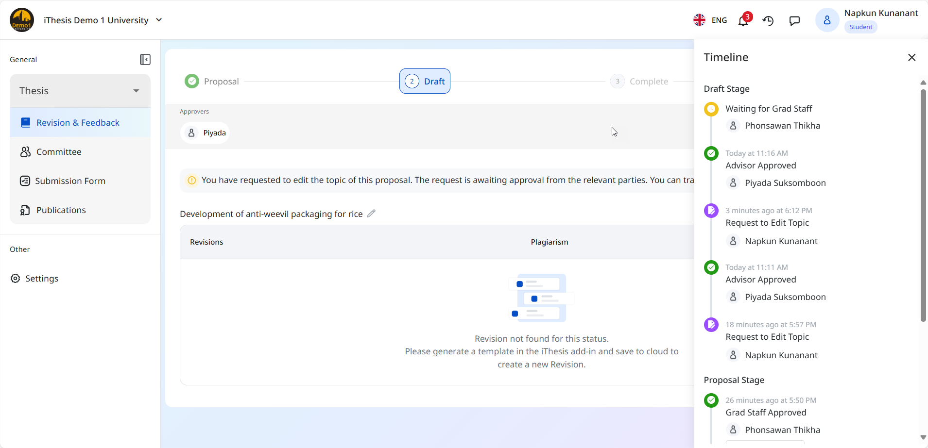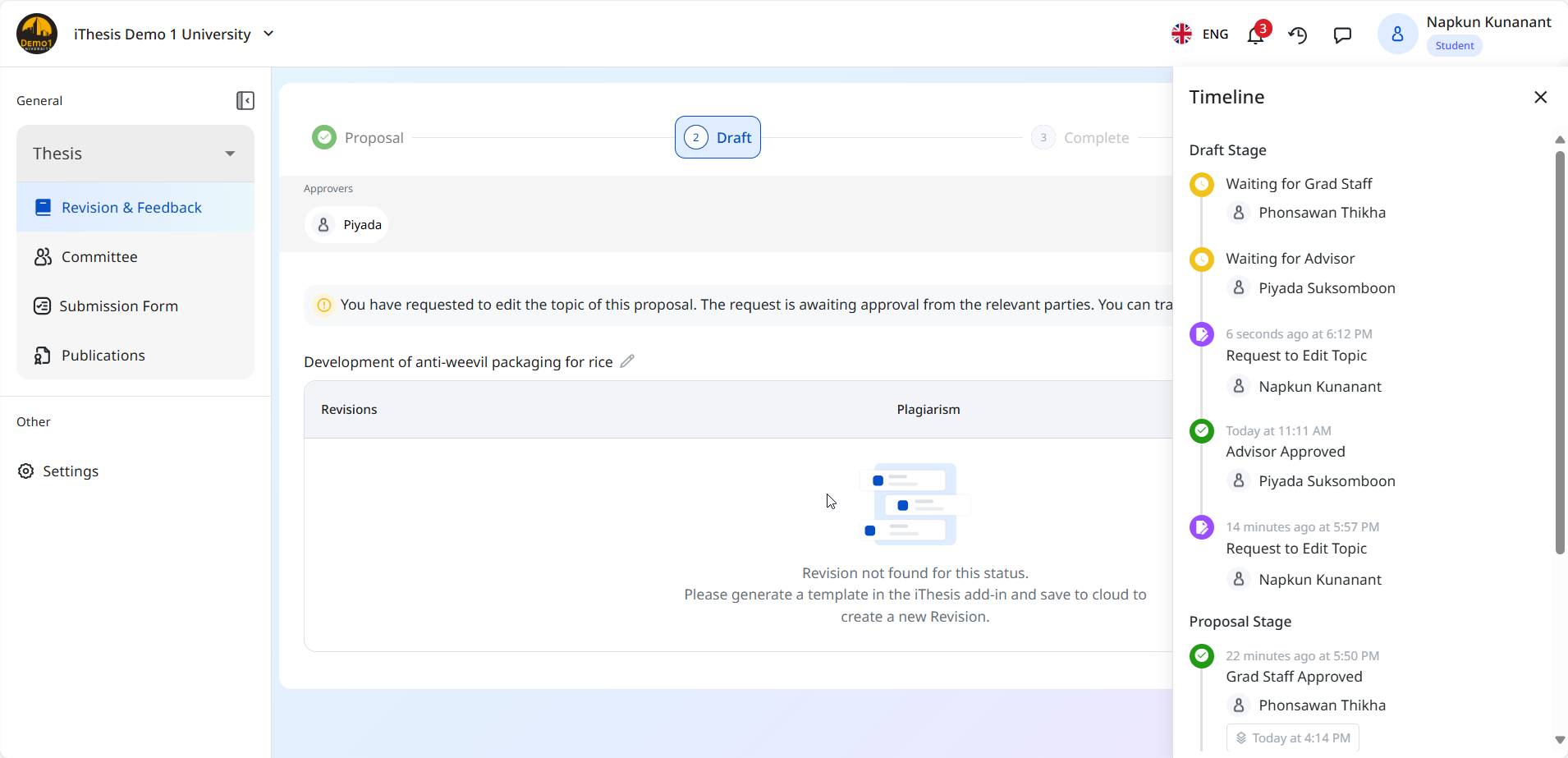 ทั้งนี้เมื่อผู้เรียนผ่านสถานะโครงร่าง (proposal) มาแล้ว บางสถาบันอาจตั้งค่าให้จำเป็นต้องทำการ "ขอแก้ไขชื่อหัวข้อ" หรือ Revise Topic เนื่องจากเป็นข้อกำหนดของทางสถาบัน