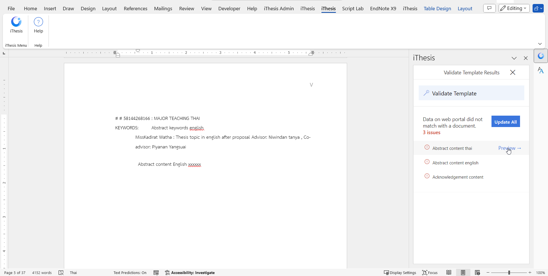 กด validate เพื่อตรวจสอบรูปเล่มก่อนจะ save to cloud โดยระบบจะสรุปรายการที่เอกสารกับเว็บพอร์ทัลไม่สอดคล้องกัน กด see details เพื่อดูรายละเอียด
